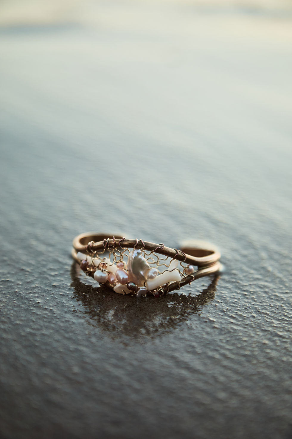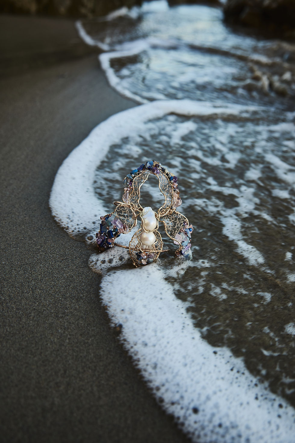 A bold, untamed composition inspired by wild irises and coastal light. Hand-sculpted in OBÉLO’s signature lace wire, this cuff combines lapis lazuli, amethyst, baroque pearls, and raw movement into a sensual, sculptural form.